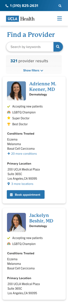 UCLA Health’s customer-facing website had accumulated tech and design debt over years of prioritizing business-first decisions, resulting in a disjointed experience that made it difficult for patients to find care through the UCLA Health website.