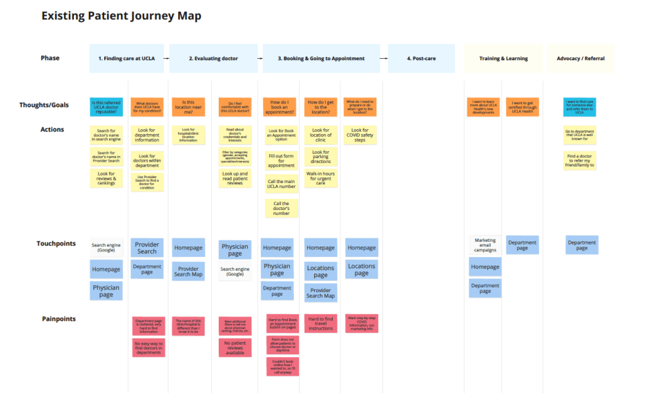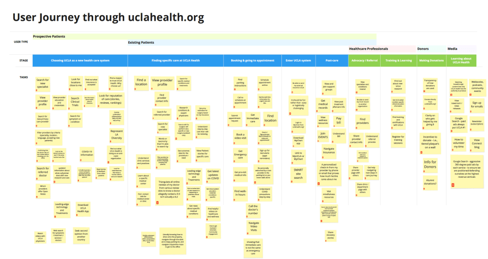 I conducted 12 stakeholder interviews with members of the UCLA Health marketing department, as well as 9 user interviews, and a survey of 55 LA residents to learn about current and prospective UCLA Health patient pain points of the current website: